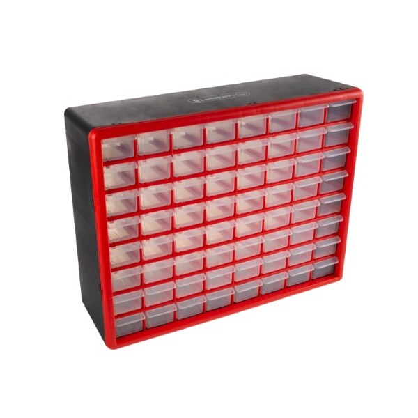 The 64 Drawer Storage Cabinet by Fleming Supply is an excellent organizational solution for your garage, home, or office. Constructed from strong and durable polypropylene, these see-through storage drawers are made to last. The container is portable and can be used on tables, countertops or desks, and is also wall mountable. With 64 bins, you can easily store and organize anything from parts, hardware, office supplies, fishing tackle, crafting materials, beads, makeup, or jewelry. It's the perfect option to keep your gear or accessories neatly sorted and tidy.