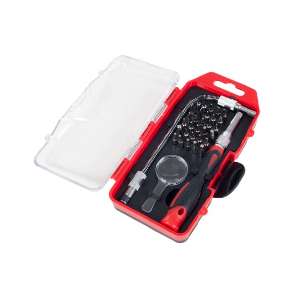 Designed for hard to reach places, the 30 Piece Precision Screwdriver Set with Flexible Shaft is perfect for IT professionals, Office use, Mechanics and more. Includes 30 bits that can be used with the regular screwdriver, or the flexible shaft. The flexible shaft can bend around corners and fit into small or hard to reach places. Includes a magnifying glass for added precision.