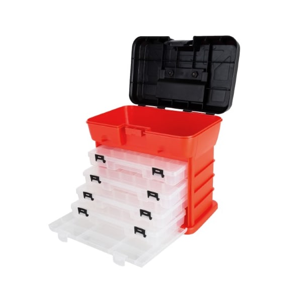 The 4-Tray Parts and Tackle Toolbox from Fleming Supply can store and organize fishing supplies, screws, hardware, thread, beads, sockets, tools, nail art supplies and so much more! This 5-compartment utility case features a drop-down door front, 4 removable organizer trays with dividers to create up to 18 compartments in each tray, a top section for larger tools and a convenient carry handle for portability. Keeping your favorite hobby supplies neat and tidy has never been easier!