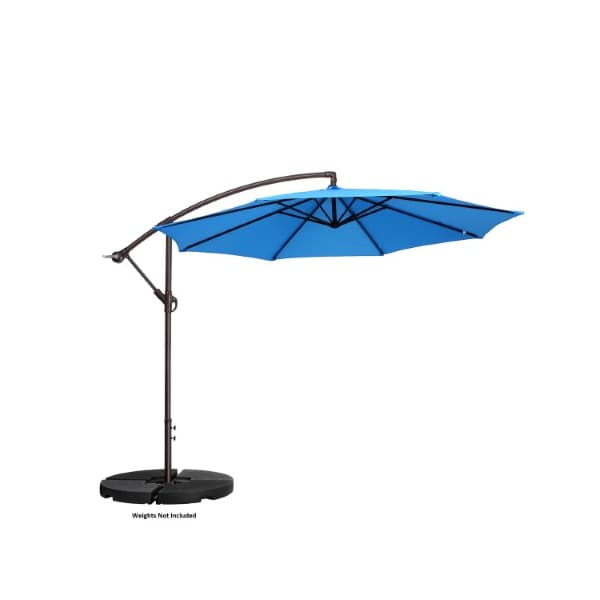 The 10-Foot Offset Patio Umbrella from Fleming Supply uses a hand crank to easily open the canopy that can tilt vertically in 5 positions to shade your outdoor area at any part of the day. The rust-resistant powder-coated aluminum pole is offset for freestanding use without a table and has a stable cross base that can fit into most umbrella bases (not included) or weighted down with sandbags. The resilient bright blue polyester fabric of the umbrella has built-in vents and is supported with 8 steel ribs so you can use it on the side of a picnic table, over poolside lounge chairs, on the back deck, patio, or with an outdoor dining set in the backyard.