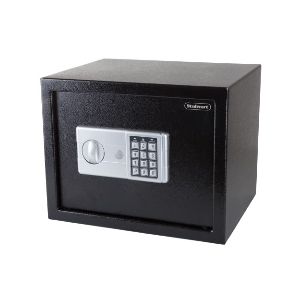 The Security Safe Box from Fleming Supply will keep your valuables carefully locked away. This compact steel safe offers 1-cubic-foot of interior space that will accommodate a wide range of personal items, including legal documents, passports, jewelry, laptops, cash and more. The contents of the lock box are hidden behind a two bolt, pry resistant steel door that requires the manual override keys or programming 3-8-digit passcode of your choice to open the electronic locking mechanism. The safe also comes with predrilled holes and hardware to mount it to the wall or floor in any bedroom, closet, office, or hotel setting.