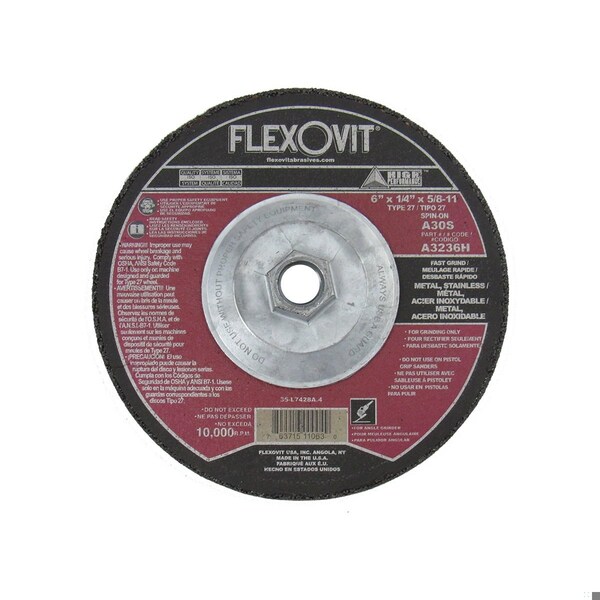 FlexOvit HIGH PERFORMANCE Depressed Centre Grinding Wheel, Fast Grind Precision, 6 in Wheel Diameter, 1/4 in Wheel Thickness, A30S Grit, Aluminum Oxide Abrasive, Wheel Type Number: Type 27, 10000 rpm Maximum, Applicable Materials: Metals and Stainless, 5/8-11 Center Hole Thread Size