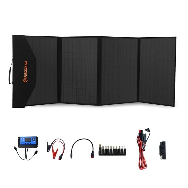 FLEX SOLAR 120W Foldable Solar Panel with Integrated QC 30 USB port, TypeC PD 60W port, and 120W DC port, as well as 10in1 interchangeable DC connectors and moreMade for camping and offgrid adventures, the 120W foldable solar panel kit is ideal for longtime trips when you need to different kinds of batteries with optimized solar chargingIntegrated QC 30 USB port, TypeC PD 60W port, and 120W DC port, as well as 10in1 interchangeable DC connectors, alligator battery clamps, DC cable, and 20A PWM solar charge controller make the 120W solar panel versatile to charge smartphones, tablets, laptops, DC electronics, and most portable power stationsCompatible with all kinds of solarpowered batteries, most portable power stations, or solar generators Gear up to explore outdoors with ecofriendly solar powerPortable and Durable Portable design and lightweight 108 Ibs 49 kg makes the 120W solar panel easy to carry and transportli IP65 waterproof, inbuilt kickstnds and rugged materials make the solar panel work under unexpected weather and last longer than other solar panelsHighEfficient and Versatile Premium monocrystalline solar cells with an energy conversion efficiency of up to 24Charge DC powered device, USB TypeC input batteries, as well as smartphones, tablets, most laptops and portable power stationsCompatible with most portable power stations, like Jackery Explorer 1602403005001000 and other batteries chargingChainable design enables you to chain solar panels together with an optional cable to use two 120W panels in parallel With a 20A PWM Solar ControllerIncludes a 20A 12V24 V PWM solar charge controller with LCD display Compatible with 12V devices, protect your devices from overcharging, overvoltage and short circuitsThe solar charge controller is preset with connection cable, easy to set upWhat can the 120W solar panel chargeEffortless and versatile charging via the integrated USB ports, TypeC port and DC port under sunlight or pair with a power battery, the 60W solar panel can charge the following devicesAll smartphones, including all iPhones, Samsung Galaxy seriesAll tablets, iPad seriesAll portable USB charging electronic devices, like wireless speakers, headset, etcMost TypeC charging laptops, includes MacBook ProMost portable power stations, like Jackery Explorer seriesMost kinds of batteries, like Lithium, Gel, LiFePO4, Flooded via the 20A 1224V PWM solar con