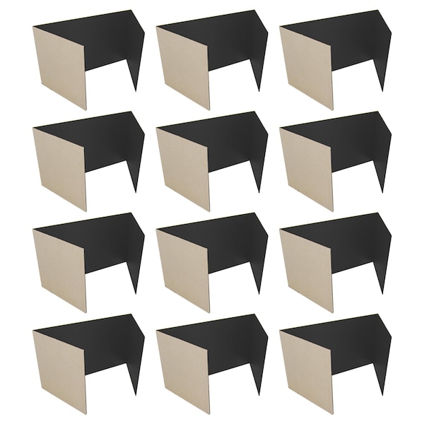 An economical solution for providing partitions in the classroom and using them as desk dividers. Keep students focused and curb wandering eyes with trifold corrugated study carrels. Ideal for instant testing centers or private study areas to eliminate distractions. Sturdy construction with clean lines and side panels that fold flat for storage when not in use. Ideal for reinforcing distancing within the classroom. Privacy folder boards measure 18in H x 48in W. Side panels measure 18in H x 12.75in W. Center panel measures 18in H x 22.5in W. Pack of 12.