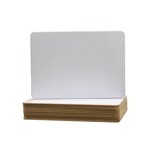 Economical, unframed mini board with a plain dry erase surface on one side is ideal for small reminders! Great for lockers or file cabinets with adhesive magnetic strips added (not included), or any time a bigger board is just too much. Quality write-and-wipe surface is non-ghosting. Hardboard backing is warp and chip resistant. Radius corners and smooth edges for comfort and safety. Measures 5" x 7" x 0.125". Bulk pack of 12.