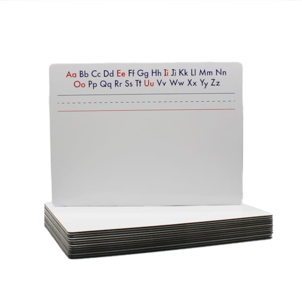 Magnetic board with reference alphabet encourages young learners to play with print! Alphabet features both lower and uppercase letters with vowels in red and consonants in blue. Handwriting line is 1" high with a broken mid-line. Features a magnetic dry erase front and a plain dry erase back. Rounded corners and smooth edges for safety and comfort. Backing is warp and chip resistant. Board measures 12" wide x 9" high x 0.125" deep. Class pack of 12.
