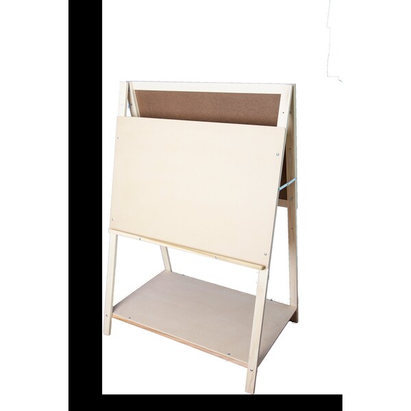The Teaching Easel is our largest easel features a magnetic dry-erase surface mounted horizontally, making group activities easier. Surface measures 35 Wx 22 H and is adjustable to two different heights. Reverse side comes with a standard masonite surface for attaching charts and writing pads. Includes two full length trays for supplies and a large 21D x 36W bottom storage shelf. Measures 54in H x 36 W.