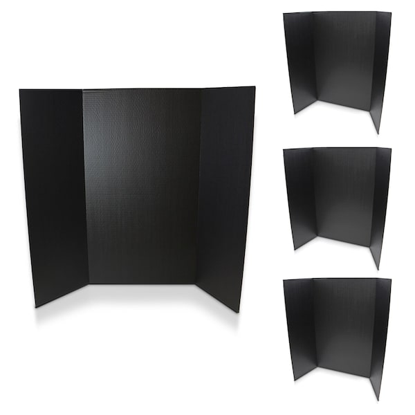 Our project display boards allow you to customize and easily create a lasting impression. The durable, smooth, bright color surface has a slight glossy finish that easily allows markers, glue, paint and adhesive. These project boards are great for science fairs, presentations, picture displays, school projects and tabletop exhibits. You can easily transport your project board because of the overlapping side panels. Our project boards have color on one side and natural brown kraft on the back. Made from 1-ply corrugated paper that is 100% recyclable. It measures 36 H x 48 W. Side panels measure 36 H x 12.75 W. Center panel measures 36 H x 22.5 W. Pack of 4 black project boards.
