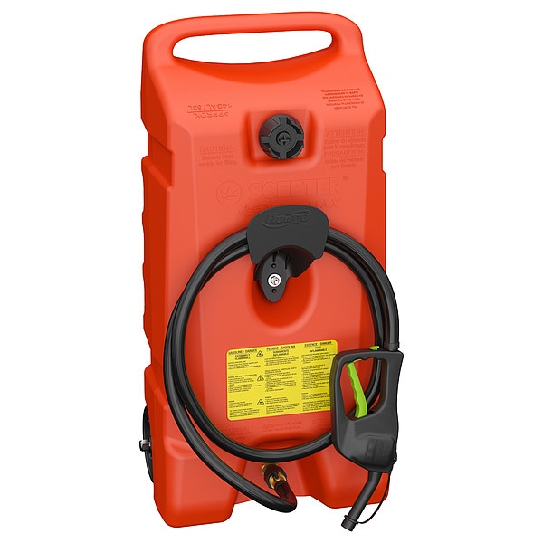 Fuel Caddy, Capacity 14 gal, Compatible Fuel Gasoline, Color Red, Tank Material Polyethylene, Dispensing Mechanism Hand Pump, Discharge Hose Length 10 ft, Height 33 3/4 in, Hose Outside Diameter 0.68 in, Includes 36 in Hose with Siphon Head, Hose Hanger and Nut, (2) Brass Shutoff Valves, Length 12 3/4 in, Product Type Fuel Caddy, Standards DOT Requirements, UN Requirements, Wheel Diameter 6 in, Wheel Type Polycarbonate, Width 16 1/4 in