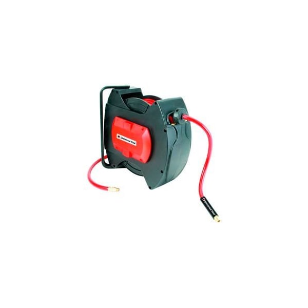 HIGH IMPACT PP MATERIAL. 3/8" X 50' PVC HOSE. 300 PSIG MAX PRESSURE. AUTOMATIC, RATCHET FREE RUNNING. STEEL MOUNTING BRACKET. BEST FOR WORK BENCH APPLICATIONS.