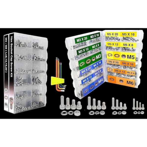 880 PCS Metric M6 M5 M4 M3 Metric Bolt Assortment Metric Screws Assortment kit 16 Sizes Set Hex Socket Head Cap Screw 304 Stainless Steel Assorted Nuts and Bolts Washer S2 Steel Allen WrenchM3: 8mm 12mm 16mm 20mm with M3 Washer, nut and spring washer 320pcsM3-8: 20pcs M3-12: 20pcs M3-16: 20pcs M3-20: 20pcsM3 Nut: 80pcs M3 Washer: 80pcs M3 Spring Washer: 80pcsM4: 8mm 12mm 16mm 20mm with M4 Washer, nut and spring washer 240pcsM4-8: 15pcs M4-12: 15pcs M4-16: 15pcs M4-20: 15pcsM4 Nut: 60pcs M4 Washer: 60pcs M4 Spring Washer: 60pcsM5: 8mm 12mm 16mm 20mm with M5 Washer, nut and spring washer 160pcsM5-8: 10pcs M5-12: 10pcs M5-16: 10pcs M5-20: 10pcsM5 Nut: 40pcs M5 Washer: 40pcs M5 Spring Washer: 40pcsM6: 8mm 12mm 16mm 20mm with M6 Washer, nut and spring washer 160pcsM6-8: 10pcs M6-12: 10pcs M6-16: 10pcs M6-20: 10pcsM6 Nut: 40pcs M6 Washer: 40pcs M6 Spring Washer: 40pcs