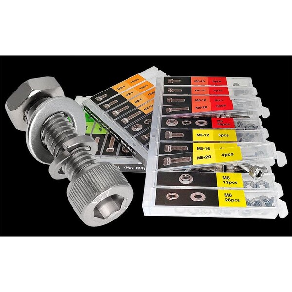 982pcs M2 M2.5 M3 M4 M5 M6 Hex Socket Cap Screws Head Cap Screws 304 Stainless Steel Nut Bolt Kit Screw Assortment Set with Machine Assorted Washer Small Spring Washer and Nut SetM2: 4mm 6mm 8mm 10mm with M2 Washer nut and spring washer 256pcsM2-4: 16pcs M2-6: 16pcs M2-8: 16pcs M2-10: 16pcs M2 Nut: 64pcs M2 Washer: 64pcs M2 Spring Washer: 64pcsM2.5: 4mm 6mm 8mm 10mm with M2.5 Washer nut and spring washer 256pcsM2.5-4: 16pcs M2.5-6: 16pcs M2.5-8: 16pcs M2.5-10: 16pcs M2.5 Nut: 64pcs M2.5 Washer: 64pcs M2.5 Spring Washer: 64pcsM3: 6mm 8mm 10mm 12mm with M3 Washer nut and spring washer 210pcsM3-6: 16pcs M3-8: 16pcs M3-10: 14pcs M3-12: 14pcs M3 Nut: 50pcs M3 Washer: 50pcs M3 Spring Washer: 50pcsM4: 8mm 10mm 12mm 16mm with M4 Washer nut and spring washer 120pcsM4-8: 10pcs M4-10: 8pcs M4-12: 6pcs M4-16: 6pcs M4 Nut: 30pcs M4 Washer: 30pcs M4 Spring Washer: 30pcsM5: 10mm 12mm 16mm 20mm with M5 Washer nut and spring washer 88pcsM5-10: 6pcs M5-12: 6pcs M5-16: 5pcs M5-20: 5pcs M5 Nut: 33pcs M5 Washer: 33pcs M5 Spring Washer: 33pcsM6: 12mm 16mm 20mm with M6 Washer nut and spring washer 52pcsM6-12: 5pcs M6-16: 4pcs M6-20: 4pcs M6 Nut: 13pcs M6 Washer: 13pcs M6 Spring Washer: 13pcs