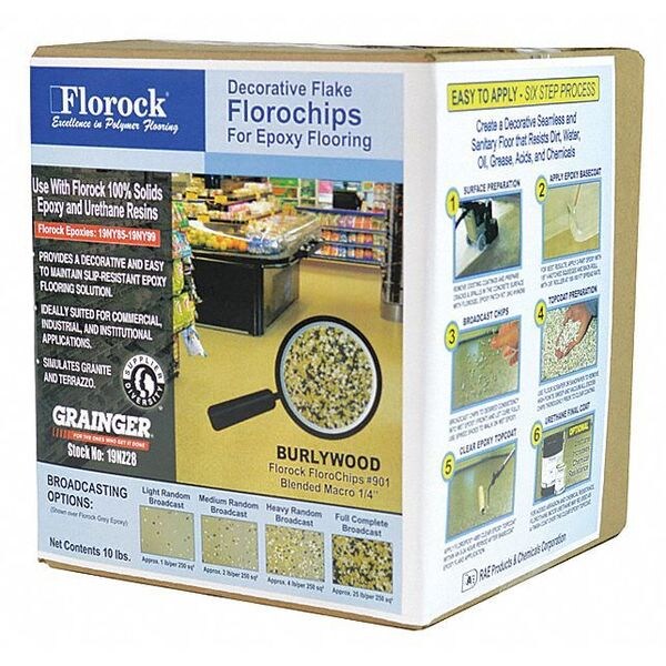 Floor Flake, Additive Type Floor Flake, Base Type Vinyl, Color Burlywood, Coverage Area 90 sq ft, Use Location Exterior, Interior, Container Size 10 lb, Application Method Broadcast, Chemical Resistant Yes, Dry Time 4 to 24 hr, Exposure Conditions Moderate, Flammability Flammable, For Use With M-142CN/U0-161CN, M0-072CN/U0144CN, M0-076CN/U0-144CN, M0-090CN/U0-141CN, M0-091CN/U0-161CN, M1-086CN/U0-173CN, M8-072KT, M8-142KT4, Mfr. No. U0-144KT, R0-158KT, U0-141KT, U0-161KT, U0-173KT