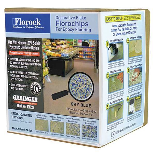 Floor Flake, Additive Type Floor Flake, Base Type Vinyl, Color Sky Blue, Coverage Area 90 sq ft, Use Location Exterior, Interior, Container Size 10 lb, Application Method Broadcast, Chemical Resistant Yes, Dry Time 4 to 24 hr, Exposure Conditions Moderate, Flammability Flammable, For Use With M-142CN/U0-161CN, M0-072CN/U0144CN, M0-076CN/U0-144CN, M0-090CN/U0-141CN, M0-091CN/U0-161CN, M1-086CN/U0-173CN, M8-072KT, M8-142KT4, Mfr. No. U0-144KT, R0-158KT, U0-141KT, U0-161KT, U0-173KT