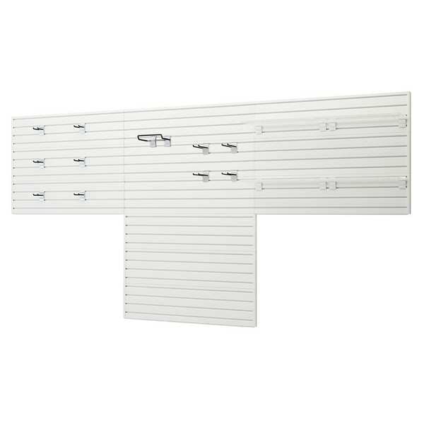 Slatwall Kit, Color White, Material PVC, Number of Bins 0, Number of Hooks 11, Number of Panels 12, Panel Load Capacity 100 lb/sq ft, Includes (4) Metal Bracket Shelves, Includes Mounting Hardware Yes, 3/4 in Overall Depth, 36 in Overall Height, 96 in Overall Width, 12 in Panel Height, Panel Width 48 in, 3 in