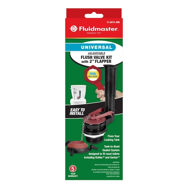 The Fluidmaster Adjustable Flush Valve Repair Kit includes everything needed to restore your toilet's flush. Quickly eliminate leaks at a common leak point, between the tank and bowl. From purchase to installation, this helpful toilet repair kit offers the simplest repair experience possible, showcasing step-by-step instructions and durable install/uninstall tools to eliminate searching for toilet repair tools. This universal design is built to work with most 2 in. flush valve toilets. The flush valve features an adjustable overflow tube, simply twist to adjust height for any toilet tank. Stop water waste and control your water use per flush with the solid frame PerforMAX Adjustable Flapper. This kit also includes the innovative universal tank-to-bowl gasket system that fits any 2 in. flush valve. Use the red gasket for standard designs, the black triangle gasket for Kohler models and combine to fit Gerber models. Eliminate leaks and save water with this durable and easy to use 2 in. toilet flush valve kit.