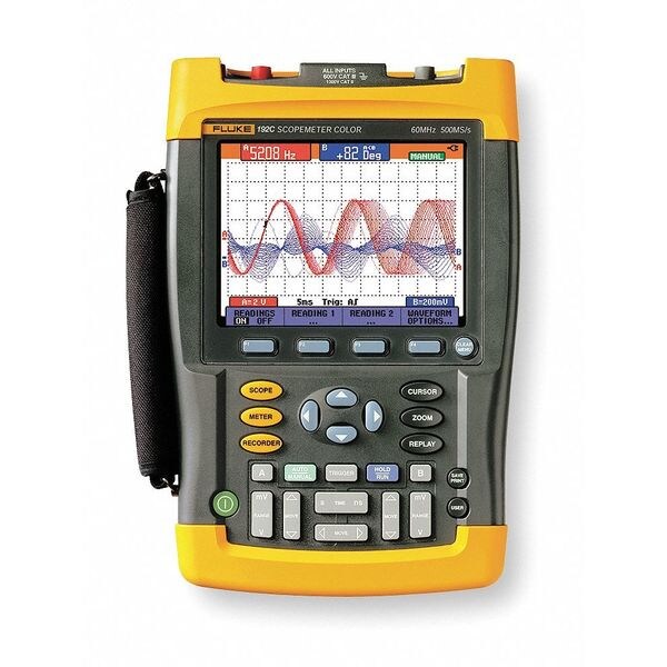 Portable Digital Oscilloscope, Bandwidth (MHz) 60, 2 Channels, Color LCD Display, True RMS Yes, Sampling Rate 500 MS/s, 10 nsec to 2 min/div Max./Min. Sweep Speed, 15 Waveform / Measurement Stored, Max. Record Length 3000 Points, FFT Analysis Yes, Cursors and Zoom Yes, Real Time Clock Yes, Connect&View(TM) + Advanced Pulse Width & Video Triggering Mode, Input Sensitivity 2 mV/Div to 100 V/Div, On/Off Persistence, Glitch Capture Yes, Optically Isolated RS-232 Interface