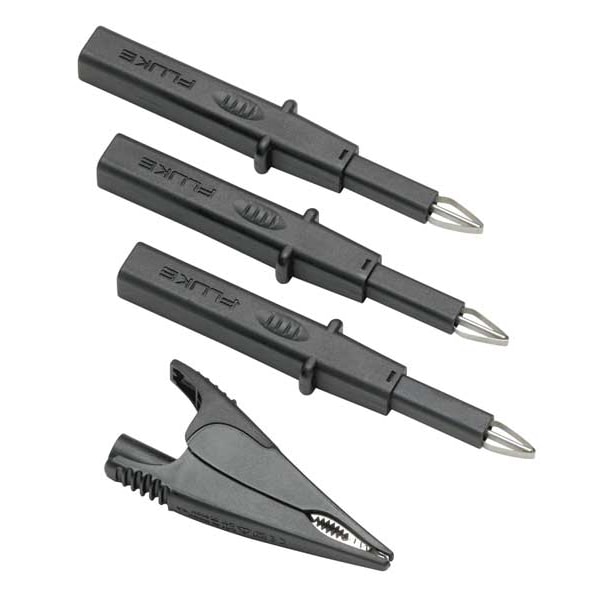 Test Probe Kit, For Use With Fluke 3PHVL-17XX, Fluke 3PHVL-17XX-5M, Fluke 9040, Maximum Current 8 A, Maximum Voltage 1,000V, Color Black, Hand Held Voltage 1,000V AC/V DC, Hands Free Voltage 1,000V AC/V DC, Instrument Safety Rating CAT II 1000V, CAT III 1000V, Features For use with 4 mm Shrouded Test Leads, Such as Fluke Tl224, Probes have Flexible Test Points that Fits Securely Between 4 and 8 mm Sockets, Test Probe Set to be used on Motor and Three Phase Sockets, Number of Alligator Clips 3