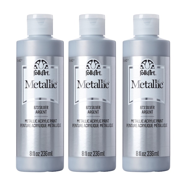 Add some shimmer to your next DIY project with FolkArt Metallic Acrylic Paint. This acrylic paint has a creamy and shiny consistency that brushes on smooth leaving a beautiful metallic finish. Our patented, self-sealing acrylic paint formula offers superior coverage and quicker drying times - making this a great paint for indoor and outdoor projects! Use on wood, paper, canvas, Styrofoam, paper mache, and so much more. This versatile acrylic paint allows you to do everything from beautiful hand paintings to stylish stenciling to design techniques to home decor DIYs and so much more. Give all your projects a modern, metallic twist with a layer of FolkArt Metallic Acrylic Paint. Sold as a pack of 3-bottles.