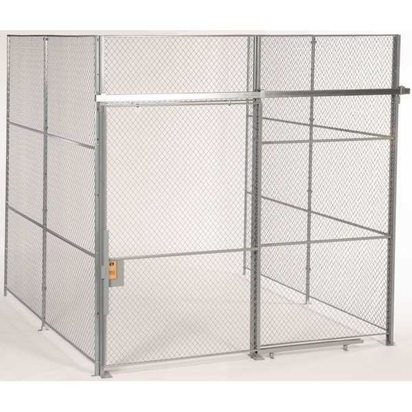 Predesigned, modular cage kit, woven wire mesh 10ga 1-1/2in diamond, overall height 10 ft., 3 Sided, exterior room width 20 ft. 3-1/4 in. with 5 ft. W x 8 ft. H sliding gate located 5 ft from corner, room depth 20 ft. 1-1/2 in., no top on cage, door includes mortise style keyed cylinder lock with two keys, door direction and lock side are reversible in field, incl necessary assembly hardware, requires assembly, excludes floor and wall anchors, materials powder coated gray