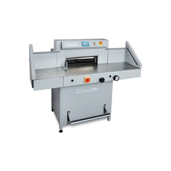 Formax cut-true fully-automatic hydraulic guillotine paper cutter the formax cut-true 29h hydraulic guillotine paper cutter offers precision cutting for paper stacks up to 20.5" wide. User-friendly, intuitive features include a touchscreen control panel, automatically-adjusting back gauge and the capacity to program up to 100 jobs/100 cuts. An infrared light beam safety curtain provides safety and convenience as it shuts down operation if the light plane is interrupted. operation is simple: utilize the touchscreen to program and select job settings, then load a stack of paper, up to 3.15" high. Set the back gauge using the touchscreen, then use the foot pedal pre-clamp to check the paper position. The bright led cutting line allows operators to see exactly where the blade will cut and make fine adjustments. Electronically-controlled two-hand operation engages the hardened steel blade for crisp, accurate cuts, every time. cutting accuracy is 0.1mm on paper stacks up to 80mm. The cut-true 29h also features a special anti-friction surface with optional wide side tables, making it easier for operators to maneuver large paper stock. The hydraulic clamp pressure is adjustable to give the best clamp possible for different paper weights and stack heights. A false clamp is included to minimize the risk of marking sensitive paper stock or perfect bound books. In addition, the clamp can be removed to decrease the minimum cut length, and stored within the machine. The cut-true 29h also features an internal light to illuminate the cutting area. standard safety features include a lock with key, blade lock, external blade depth adjustment, automatic blade return from any position, easy-to-use blade change safety tool, and a wooden paper push for safe alignment. The cut-true 29h is ideal for transforming large sheets into brochures, invitations and more, with crisp, accurate cuts, and is a welcome addition to print shops and in-plant finishing operations. feature