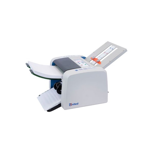 United f100 tabletop document folder - 200 sheet capacity the united f100 automatic paper folder is an ideal solution for low-volume folding projects. This compact unit processes up to 156 sheets per minute in 11" and 14" paper sizes. It's clearly marked for 4 common fold settings. the lcd control panel features a resettable 3-digit counter with a batch setting to process a specific number of sheets, for easy unloading. the output conveyor includes easily adjustable stacker wheels for neat, sequential stacking of folded pieces. the clearly-marked fold settings and simple out-of-the-box operation make it the perfect addition to schools, churches, and offices looking for easy setup and minimal adjustments. features: hopper capacity: up to 200 sheets 20# (75 gsm) speed: up to 156 sheets per minute paper size: min 4" w x 5" l, max: 8.5" w x 14" l paper weight: up to 30# (90 gsm) fold types: c, z, v, double parallel dimensions: 24" l x 14" w x 14.5" h weight: 23 lbs power: 120v ac, 50/60hz safety certification: ce approved