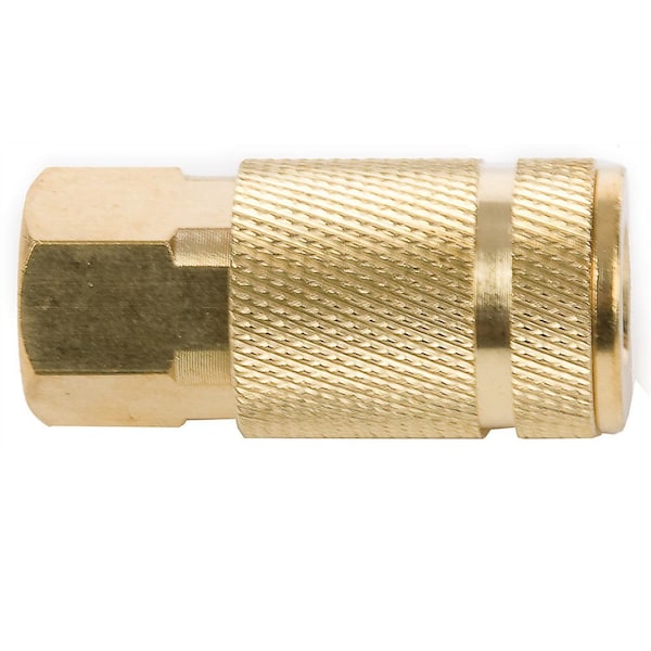1/4in Aro compatible coupler with 1/4in female national pipe thread NPT. Intended for use on compressed air lines only.Product Specifications:* 1/4in 6.35 millimeters x 1/4in 6.35 millimeters* Material: Brass* Maximum working pressure: 300 pounds of force per square inch PSI* Comes in bulk packaging* Carded packaging version is Forney Industries ITEM# 75318