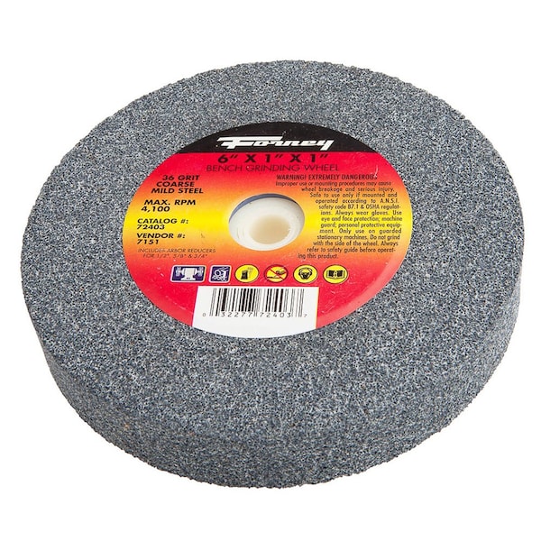 Bench Grinding Wheel, Vitrified bond, aluminum oxide wheel. Designed for most stationary bench grinders. For general grinding and sharpening applications on mild steel. __Not for carbide applications.__ * Wheel Size: 6in * Thickness: 1in * Arbor: 1in * Grit: 36 * Max RPM: 4,100 * Tool Type: Bench Grinder