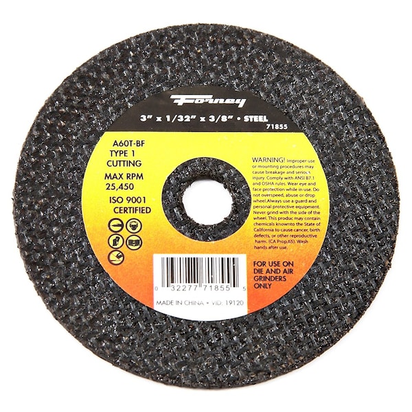 This Forney aluminum oxide steel cutting wheel is ideal for use on ferrous materials. Itfts engineered for metal cutting, metal abrasion, body work, metal fabrication, and general repair work. Designed to be used on Die and Air Grinders only. Type 1 wheels feature a flat wheel design for metal cutting applications.Product Specifications:* Wheel Size: 3 in* Wheel Type: Type 1 Flat* Thickness: 1/32 in* Arbor: 3/8 in* Abrasive Specification: A60T-BF* Abrasive Grain Type: A aluminum oxide* Grit: 60 medium* Bond Hardness: T hard: longer life, slower cutting or grinding* Type of Bond: BF resinoid fiberglass reinforced* Maximum Revolutions Per Minute RPM: 25,465* Tool Type: Die/Air Grinder