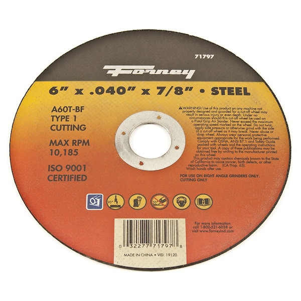 This Forney aluminum oxide steel cutting wheel is ideal for use on ferrous materials. Itfts engineered for metal cutting, metal abrasion, body work, metal fabrication, and general repair work. Designed to be used on right angle grinders only. Type 1 wheels feature a flat wheel design for metal cutting applications.Product Specifications:* Wheel Size: 6 in* Wheel Type: Type 1 Flat* Thickness: .040 in* Arbor: 7/8 in* Abrasive Specification: A60T-BF* Abrasive Grain Type: A aluminum oxide* Grit: 60 medium* Bond Hardness: T hard: longer life, slower cutting or grinding* Type of Bond: BF resinoid fiberglass reinforced* Maximum Revolutions Per Minute RPM: 10,185* Tool Type: Right Angle Grinder