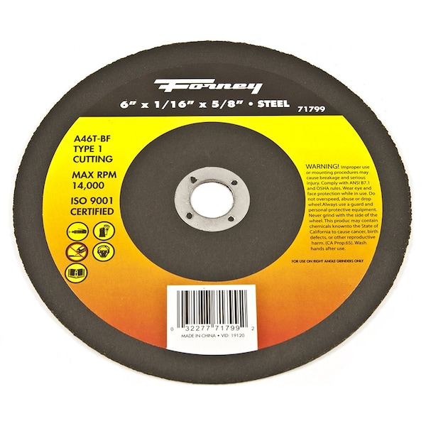 This Forney aluminum oxide steel cutting wheel is ideal for use on ferrous materials. Itfts engineered for metal cutting, metal abrasion, body work, metal fabrication, and general repair work. Designed to be used on Right Angle Grinders only. Type 1 wheels feature a flat wheel design for metal cutting applications.Product Specifications:* Wheel Size: 6 in* Wheel Type: Type 1 Flat* Thickness: 1/16 in* Arbor: 5/8 in* Abrasive Specification: A46T-BF * Abrasive Grain Type: A aluminum oxide* Grit: 46 medium* Bond Hardness: T hard: longer life, slower cutting or grinding* Type of Bond: BF resinoid fiberglass reinforced* Maximum Revolutions Per Minute RPM: 10,185 * Tool Type: Right Angle Grinder