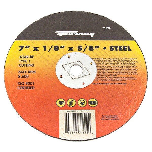 This Forney aluminum oxide steel cutting wheel is ideal for ferrous materials. Itfts engineered for metal cutting, metal abrasion, body work, metal fabrication, and general repair work. Designed to be used on Circular Saws only. Type 1 wheels feature a flat wheel design for metal cutting applications.Product Specifications:* Wheel Size: 7 in* Thickness: 1/8 in* Arbor: 5/8 in* Abrasive Specification: A24R-BF* Abrasive Grain Type: A aluminum oxide* Grit: 24 coarse* Bond Hardness: R medium* Type of Bond: BF resinoid fiberglass reinforced* Maximum Revolutions Per Minute RPM: 8,600* Tool Type: Circular Saws