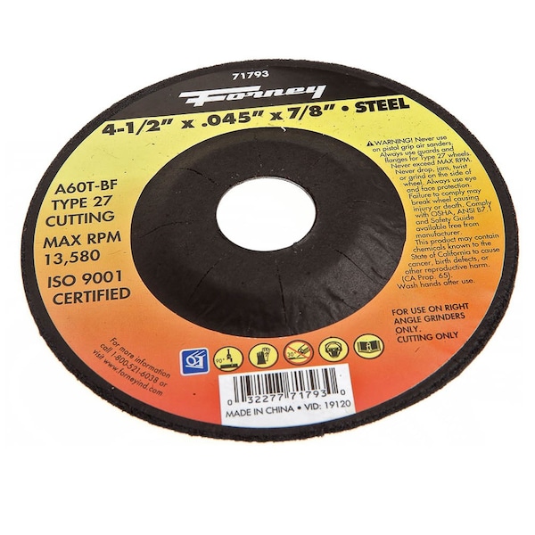 This Forney aluminum oxide metal cutting wheel is ideal for use on ferrous materials. Itfts engineered for metal cutting, metal abrasion, body work, metal fabrication, and general repair work. Designed to be used on Right Angle Grinders with proper adapters. Type 27 wheels feature a depressed center wheel for grinding, notching, and cutting applications.Product Specifications:* Wheel Size: 4-1/2 in * Wheel Type: Type 27 Depressed Center* Thickness: .045 in * Arbor: 7/8 in * Abrasive Specification: A60T-BF * Abrasive Grain Type: A aluminum oxide* Grit: 60 medium* Bond Hardness: T hard: longer life, slower cutting or grinding* Type of Bond: BF resinoid fiberglass reinforced* Maximum Revolutions Per Minute RPM: 13,580 * Tool Type: Right Angle Grinder
