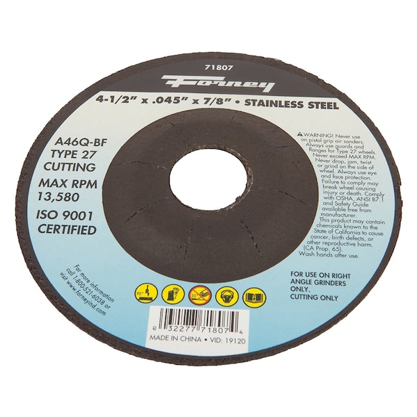 This Forney aluminum oxide metal cutting wheel is ideal for use on stainless steel materials. Itfts engineered for metal cutting, metal abrasion, body work, metal fabrication, and general repair work. Designed to be used on Right Angle Grinders only. Type 27 wheels feature a depressed center wheel for grinding, notching, and cutting applications.Product Specifications:* Wheel Size: 4-1/2 in* Wheel Type: Type 27 Depressed Center* Thickness: .045 in* Arbor: 7/8 in* Abrasive Specification: A46Q-BF* Abrasive Grain Type: A aluminum oxide* Grit: 46 medium* Bond Hardness: Q medium* Type of Bond: BF resinoid fiberglass reinforced* Maximum Revolutions Per Minute RPM: 13,580* Tool Type: Right Angle Grinder