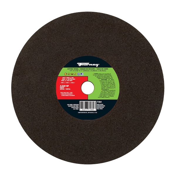 10in x 3/32in A36R-BF Type 1 steel cutting wheel with 1in arbor. Aluminum oxide metal cutting wheel. Designed for metal cutting, metal abrasion, body work, metal fabrication and general repair work. Used on ferrous materials. For use on chop saws only. Product Specifications:* Wheel Size: 10in* Thickness: 3/32in* Arbor: 1in* Spec: A36R-BF* Max RPM: 6,100* Tool Type: Chop Saws