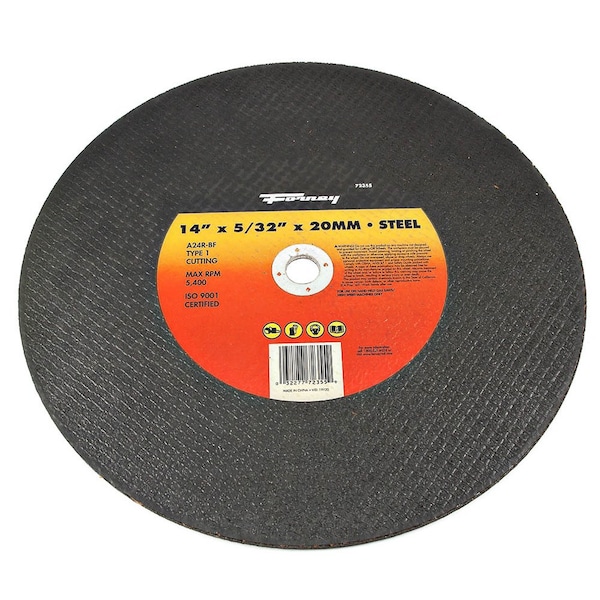 This Forney aluminum oxide steel cutting wheel is ideal for use on ferrous materials. Itfts engineered for metal cutting, metal abrasion, body work, metal fabrication, and general repair work. Designed to be used on hand held gas saws or high speed machines only. Type 1 wheels feature a flat wheel design for metal cutting applications.Product Specifications:* Wheel Size: 14 in* Wheel Type: Type 1 Flat* Thickness: 5/32 in* Arbor: 20 mm* Abrasive Specification: A24R-BF* Abrasive Grain Type: A aluminum oxide* Grit: 24 coarse* Bond Hardness: R medium* Type of Bond: BF resinoid fiberglass reinforced* Maximum Revolutions Per Minute RPM: 5,400* Tool Type: Hand Held Gas/High Speed Saws