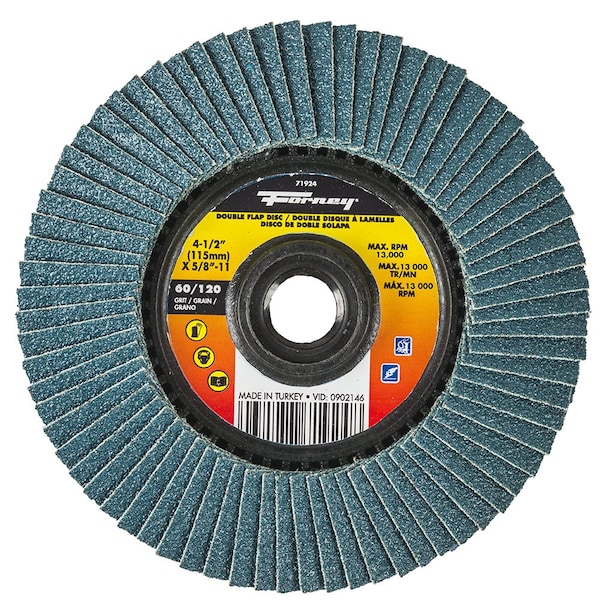 Two flap discs in one product! Type 29 double-sided flap discs allow you to complete two process applications, such as grinding and finishing, using the same product. 60/120 grits provide a medium to fine finish. Designed for grinding, blending, sanding and finishing on a wide range of materials.Product Specifications:* Double-sided flap discs are welded to a plastic spin-on 5/8in-11 center which allow you to keep the job moving with ease* Wheel size: 4-1/2in 114.3 millimeters* Grits: 60/120* Wheel type: Type 29 depressed center* Max RPM: 13,500* Tool Type: Right Angle Grinders