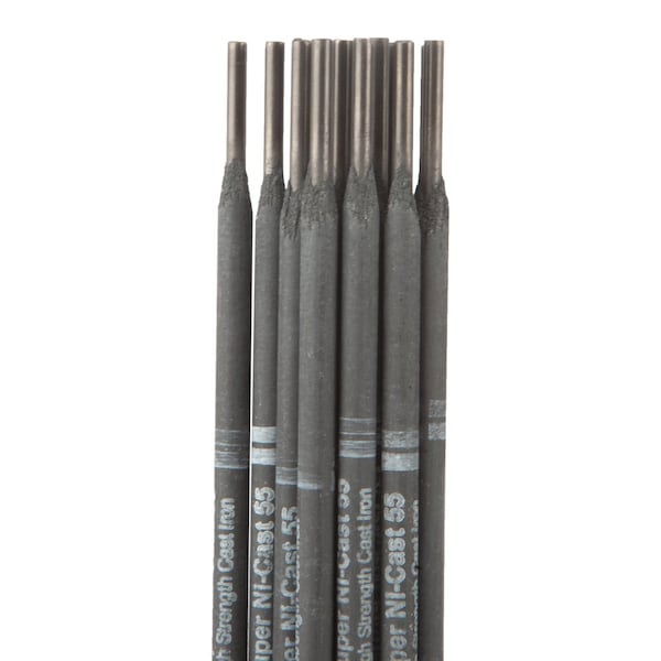 Super Ni-Cast 55% nickel is the ultimate rod for all known grades of cast iron. Extra nickel content for crack resistant, machinable welds. Great for joining heavy or thin sections to steel. The computer controlled coating produces welds that represent the optimum balance between tensile strength and machinability. Typical applications include welding grades 30, 40 and 50 gray cast irons - all thicknesses in all positions. PRODUCT SPECIFICATIONS* Hardness: Rockwell B 88-90, Brinell 185, Vickers 189 * Recommended Polarity: DC Reverse + or AC * Diameter: 1/8in * Length: 14in * Weight Lbs. Kg: 1 .453 * Tensile Strength: 70,000 PSI 500 MPa * Yield Strength: 49,000 PSI 350 MPa * Amperage: 50-80 WELDING POSITIONS* Flat, vertical up, horizontal and overhead
