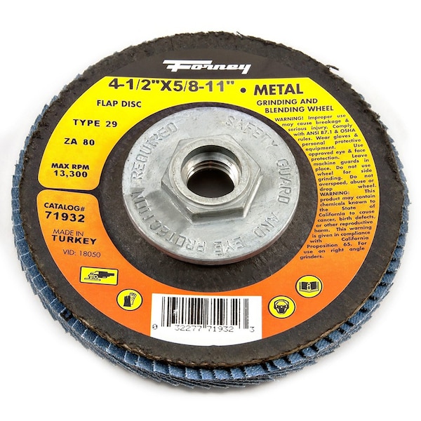 Forney blue zirconia flap discs cut fast and outlast sanding discs 10-to-1. This disc also offers great flexibility. Itfts the ideal abrasive disc for rough or fine finishing. The multiple layers of zirconia cloth flaps constantly expose new extra sharp grinding points for extended product life. Laminated by state-of-the-art automated equipment. Reinforced fiberglass backing plate. Each disc is balance tested for vibration-free grinding/finishing. Type 29 wheels are excellent for grinding and finishing applications. Designed to be used on Right Angle Grinders.Product Specifications:* Wheel Size: 4-1/2 in* Wheel Type: Type 29 designed for grinding and finishing* Arbor: 5/8 in-11* Abrasive Specification: ZA80* Abrasive Grain Type: ZA alumina zirconium* Grit: 80 fine* Maximum Revolutions Per Minute RPM: 13,300* Tool Type: Right Angle Grinder