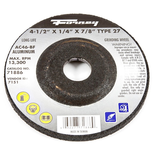 Grinding Wheel, Metal for Aluminum Type 27, Depressed Center, 4-1/2in X 1/4in X 7/8in Arbor AC46. Aluminum oxide and silicon carbide aluminum grinding wheel. Designed for aluminum grinding, body work, fabrication and general repair work. Used on non-ferrous materials. Designed to be used on right angle grinders. Wheel Size: 4-1/2in, Thickness: 1/4in, Arbor: 7/8in, Spec: AC46, Max RPM: 13,300, Tool Type: Right Angle Grinder.