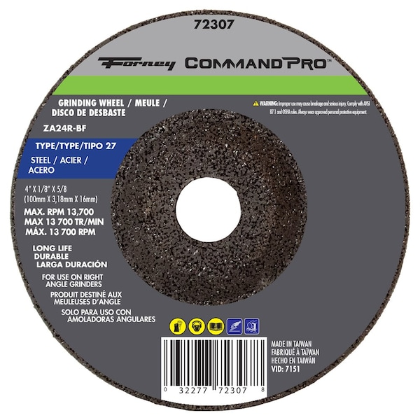 Grinding Wheel, Metal, Type 27, Depressed Center, 4in x 1/4in x 5/8in Arbor, ZA24R. Zirconium grain, premium metal grinding wheel. Designed for metal grinding, metal abrasion, body work, metal fabrication and general repair work. Used on ferrous materials. For use on right angle grinders. Product Specifications:* Wheel Size: 4in * Thickness: 1/4in * Arbor: 5/8in * Spec: ZA24R * Max RPM: 13,700 * Tool Type: Right Angle Grinders