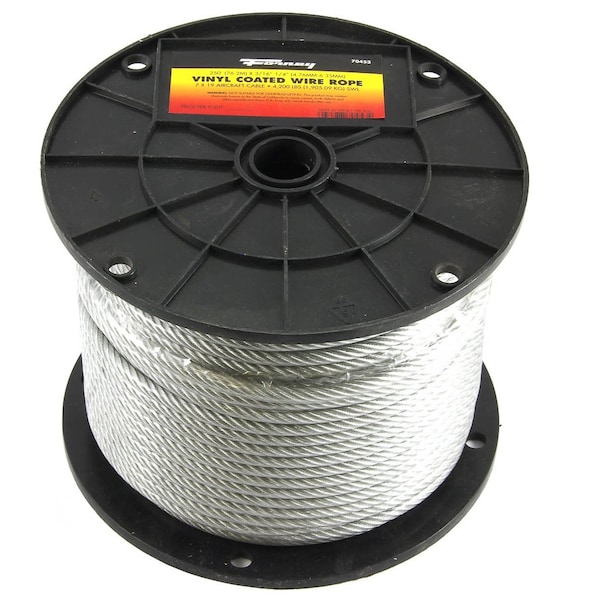 Spool, vinyl coated wire rope aircraft cable. 250ft 76.2 m x 3/16in-1/4in 4.76 mm - 6.35 mm vinyl coated wire rope 7 x 19 aircraft cable. Small diameter construction wire rope is not intended for aircraft use but is designed for industrial and marine applications. 7 x 19 rotation resistant wire ropes are designed to resist the tendency to spin or rotate under load and are ideal for general purpose use on single-part crane lines to lift a free load, or where rotation resistance is crucial.Specifications: Breaking Strength: 4,200 lbs. 1,905.09 Kg. Working Load Limit WLL: 840 lbs. 381 Kg.