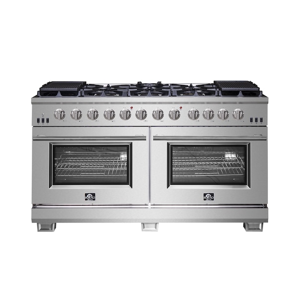 10 Sealed Dual Ring Brass Burners, Double Ovens, Continuous Cast Iron Grates, 3-Layer Glass Oven Door, Illuminated Metal Control Knobs, Adjustable Legs