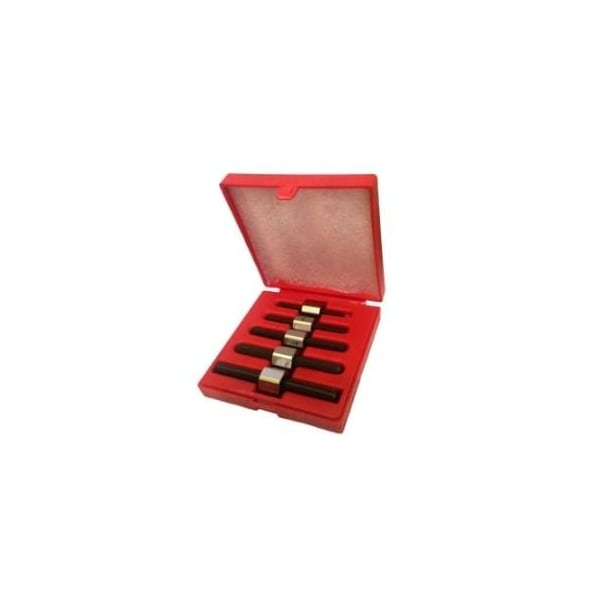 Set of 5 broken screw extractors. Contains 5 males and 5 nuts in a plastic red case. Composed of straight knurled males that prevent the screws from expanding when driven in.