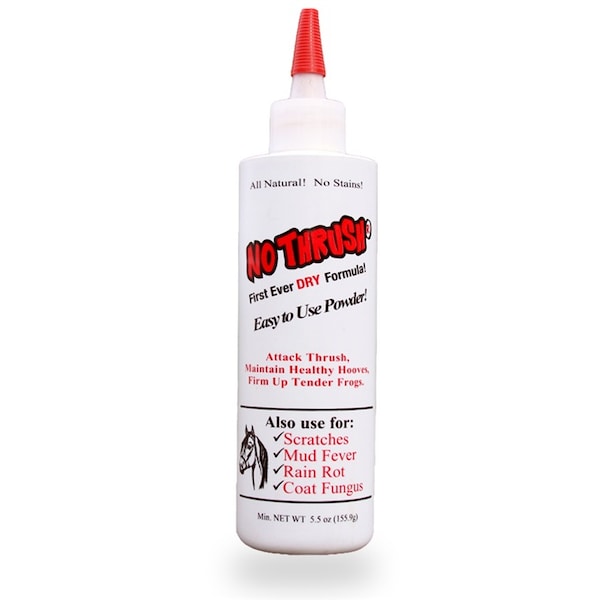 The first ever "DRY" approach to thrush treatment. It is a safe, all natural formula that is "dusted on" with a thin-tipped squeeze bottle, which provides excellent coverage of the infected area. The ingredients have been ground into a fine powder so it finds the damp, deep-in places that wet products can not find. It will not burn your horses tender tissue with chemicals. Full detail at www.nothrushshop.com.