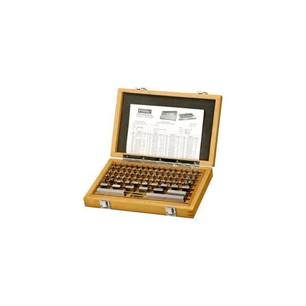 FOWLER® SHOP-BLOX® RECTANGULAR GAGE BLOCK SET - 36 PIECE MANUFACTURED TO MEET N.I.S.T. FEDERAL SPECIFICATION ASME B89. 1.9 - 2002 TOLERANCES ON LENGTH FOR INCH GAGE BLOCKS. CERTIFICATE OF CALIBRATION TRACEABLE TO N.I.S.T. TOLERANCES TO ±.00005" 36 PCS. 9 BLOCKS .1001" THRU .1009" STEP OF .0001", 9 BLOCKS .101" THRU .109" STEP OF .001", 9 BLOCKS .110" THRU .190" STEP OF .01, 5 BLOCKS .100" THRU .500" STEP OF .1", 3 BLOCKS 1", 2", 4", 1 BLOCK .050". IN HIGH-QUALITY FITTED WOOD CASE.