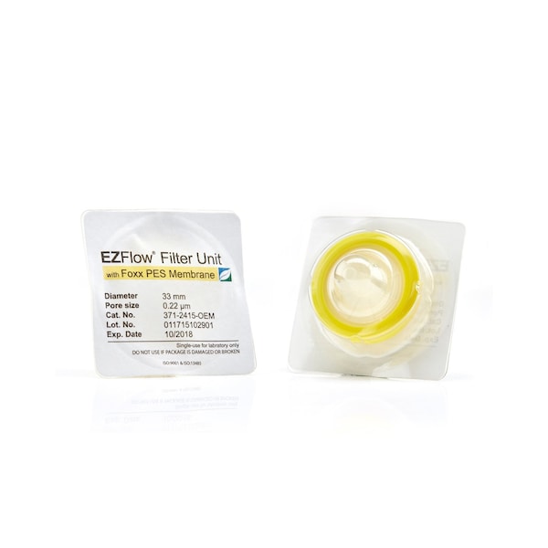 EZFlow Sterile Polyethersulfone (PES) Syringe Filters, 0.45 um Membrane for Clarification or Prefiltration, 33 mm, 100/PK
