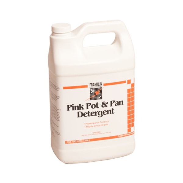 Franklin Cleaning Technology’s Pink Pot & Pan Detergent is specially formulated to cut through tough grease, baked on food and stains on pots, pans and other dishes. Neutral pH formula provides long-lasting suds and is gentle on hands and skin. Rinses free and leaves no streaks or film residue. Available in 1 Gallon Size.