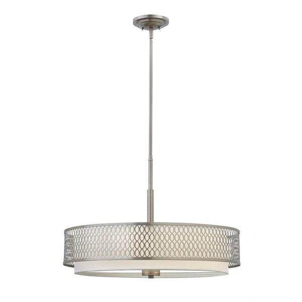 Jules features a repeating stamped oval design in a luxe Brushed Gold or Brushed Nickel finish. This striking pattern play creates a statement-making transitional silhouette.