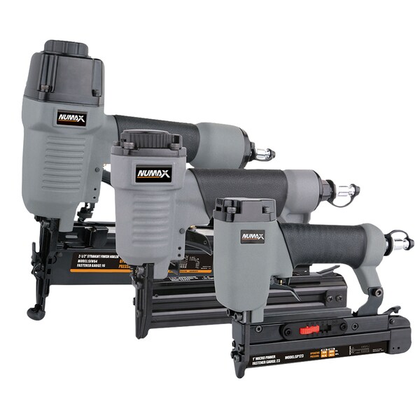 The NuMax NM6432123 Pneumatic Finishing Nailer Kit (3 piece) is used for finishing needs from crown moulding to detailed finishing jobs. The straight finish nailer is equipped a finger depth adjustment, open nose design, comfort grip handle, 360 degree adjustable exhaust, quick jam release, no mar tip and more. The brad nailer is equipped with a 360 degree adjustable exhaust, wide fastener range, durable die cast aluminum, anti-dust cap, comfort grip handle and more. The 23-gauge 1 " micro pinner is equipped with a light weight die cast aluminum body, bottom loading magazine, comfort grip handle and more. The Pneumatic Finishing Nailer Kit (3 piece) will ensure professional results for DIYers at home as well as contractors at the job site